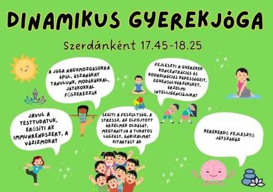 A dinamikus gyerekjóga foglalkozás a nagymozgásokra épül, gyakoroljuk az alapászanákat és mondókákkal, játékokkal fűszerezzük. Célja a mozgás megszerettetése, a testi-lelki egyensúly kialakítása, a feszültség oldása, a helyes testtartás kialakítása.